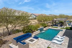 Welcome Home to the Sought-After Serendipity Floorplan - Where Luxury and Comfort Meet! Step into an open-concept floor plan that offers seamless living and dining spaces, perfect for entertaining and everyday living. The gourmet kitchen is a chef's dream, featuring high-end appliances, quartz countertops, and a walk-thru pantry for added convenience and so much storage. The luxurious primary suite is an absolute standout, bathed in natural light with an abundance of windows. It features a massive walk-in closet, a spa-like tub, a walk-in shower, and a double vanity with ample storage-creating the ultimate relaxing retreat. Each guest room with its own en suite bathroom, ensuring comfort and privacy for all. The versatile den is ideal for a home office, library, or playroom. Step outside into your own resort-style backyard, complete with a heated pool and Baja deck for ultimate relaxation. Enjoy cozy nights by the fire pit or gather around the ramada with a fire table. The large covered patio is perfect for dining al fresco, while the built-in BBQ makes outdoor entertaining a breeze. The front courtyard adds an elegant touch of curb appeal and a great place to enjoy your morning coffee. This stunning home blends modern luxury with serene outdoor living...Welcome Home!