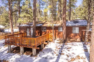 Charming 3bed/2bath single level home on a large lot (.23 acres) in beautiful Kachina Village. Large front driveway for all your vehicles plus an attached one car garage/work shop. Open plan kitchen/living room with real wood stove and hardwood floors throughout the main living area. Primary has an en suite shower and main bathroom has a claw foot tub. The back yard is fully fenced with an added open sun deck. Situated amongst the pines, close to trails and only ten minutes from Flagstaff's main shopping area. Great primary home or rustic getaway. No HOA. Call today!