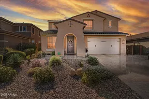 Highly upgraded Adora Trails home with a heated pool, spa & gorgeous mountain views! Tall ceilings, custom fireplace & living center piece, upgraded flooring, Ecobee thermostats, large tandem garage with built in cabinets, open layout & a host of amazing upgrades! The kitchen was upgraded in 2021 & features tall cabinets, granite counter tops, stainless-steel appliances including a gas cooktop, island with breakfast bar seating & a formal dining room. The home is well equipped for relaxing or having a little fun with a custom bar, two wine fridges, . The master suite is spacious, bathroom has double sinks, upgraded walk-in shower, separate soaking tub & large walk-in closet. The backyard is absolutely stunning & comes with a covered patio with motorized sun shades, heated (click more) pool, spa, travertine decking, synthetic grass, mature landscaping on automatic watering system & no neighbors with open land & gorgeous mountain views in the south facing backyard! The home is close to some of Arizona's top school district and A+ Schools like Basha High School, Arizona Prep & American Leadership Academy within 5 miles! Adora Trails is a beautiful lake community with walking paths, sports courts, community center, heated community pool, workout facility & gorgeous entertaining spaces!