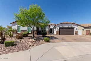 Welcome to your DREAM home in the sought-after Layton Lakes! This gorgeous residence offers 5 beds, 3 baths, and a split 3-car garage. Sits on an oversized lot of a premium cul-de-sac, displaying a great curb appeal highlighted by stone accent details, paver driveway, & a manicured landscape. The home exudes elegance enhanced by plantation shutters, tall ceilings, a designer palette, recessed lighting, tons of natural light, and wood-look tile flooring w/carpet in all the right places. The inviting living room is paired with multi-sliding doors merging the inside/outside activities. The gourmet eat-in kitchen is a chef's delight! It features granite counters, ample white cabinetry, a walk-in pantry, a large island w/breakfast bar, and high-end SS appliances w/professional-grade gas range. A dry bar in the hallway! For added functionality, this beauty includes a versatile den for an office and a cozy bonus room with a wet bar. The owner's suite has a lavish bathroom with two vanities, a soaking tub, a separate shower, & a custom walk-in closet. Laundry room with a sink & cabinetry. The RESORT-STYLE backyard is equally impressive! Designed for ultimate relaxation and entertainment, this space showcases a covered patio, built-in bar/BBQ & firepit under the pergola, artificial turf, and a fenced sparkling pool w/travertine decking for year-round enjoyment. Layton Lakes offers a vibrant community with a spacious park, a fishing dock, a jogging track, a splash pad, covered picnic areas, equestrian trails, and more. Conveniently located near the 202 freeway, this neighborhood provides easy access to restaurants, entertainment, San Tan Village Mall, and downtown Gilbert. What's not to like? Truly a MUST-SEE!