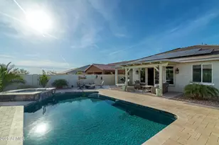 Amazing home from the front door to the backyard, this house has it all with the three car garage, upgraded finishes throughout with a resort style backyard! This nice open and split floorpan is very cozy with two front bedrooms that are connected to a full bathroom, another half bathroom just inside the garage door of the three car tandem garage, big wide entry hall that leads into the big open kitchen, living room & dining each with their own sliding glass doors and covered patios just steps away from the BEAUTIFUL POOL and IN GROUND SPA, GAS FIRE PIT all surrounded with high end travertine pavers for plenty of EXTRA patio space. This home has owned solar panels that come with the house that are connected to the grid so you will get credits for electricity you don't use from the solar.