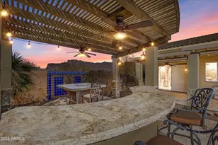 This stunning property boasts over $200,000 in upgrades & features a unique Great Room extension, crafted by the nationally acclaimed builder, Toll Brothers. No other Las Lomas plan offers this exceptional space. Situated on a private cul-de-sac with breathtaking Superstition Mountain views, this home showcases exquisite upgrades such as slate flooring, cherry cabinets, granite countertops, & custom shutters. The custom-designed features include a cultured stone exterior, a built-in bar, an alder built-in desk & cabinets, & a heated pool with a water feature & raised spill-over spa. The outdoor oasis is complete with a natural gas BBQ, a raised gazebo-covered patio with a bar, & extended covered/uncovered patios with travertine tile - all offering spectacular Superstition Mountain views! Additional features include a 3-car garage with a service door to the rear yard and a mini-split AC unit with hand held remote for added comfort, built-in cabinets, a workbench, epoxy flooring, a paver driveway, situated in a prime location backing onto a desert hill with adjacent open space. This stunning Toll Brothers home boasts an upgraded kitchen that will delight any culinary enthusiast. The kitchen features a center island with an electric cooktop, breakfast bar, and breakfast nook, all illuminated by custom overhead lighting. The kitchen also includes double wall ovens, a built-in microwave, abundant custom granite countertops, cherry cabinetry, under-cabinet lighting, matching black appliances, a walk-in pantry, and a wine refrigerator. A separate built-in bar with custom cabinetry and granite countertops provides the perfect space for entertaining. The family room offers comfort and entertainment with leather motorized single and double recliners and a built-in entertainment center that convey with the home. The laundry room features an extended folding table and cabinetry for added convenience. The private front courtyard features natural stone leading from the driveway and a custom steel-designed front entrance gate, creating a grand entrance to the home. The rear yard is an entertainer's paradise with a built-in natural gas firepit, a raised travertine tiled patio deck behind the spa which flows into the gorgeous pebble tec pool with a water fall, which also includes a removable pool safety barrier (currently removed and stored) & a raised gazebo-covered patio with a granite countertop bar. The views of the Superstition Mountains and the evening sunsets from this primely positioned lot are truly magical and for those late afternoon time periods the roll down patio blinds provide cover from the sun. The home has an existing Ring security camera system that is hard wired and conveys with the home. This home has every feature you would expect in a Toll Brothers home and more!