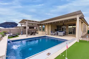 This meticulously cared for 2 bed/2 bath active-adult pool home in guard-gated Cantamia has a split floor plan, spacious living area and dedicated dining area. Sliding doors open to a fantastic outdoor entertaining oasis with covered patios, heated and jetted spool with water feature, gas fire table and outdoor BBQ. Appreciate a gourmet kitchen with fresh white cabinetry, crown molding, soft close drawers, stainless appliances, gas stove, gorgeous, upgraded Quartz counter tops and beautiful wood look tile flooring! The voluminous primary suite has a walk-in shower, dual sinks, built in closet system, and Bay window overlooking the pool. There are Plantation shutters throughout, upgraded 72in ceiling fan in the great room and custom cabinets and entertainment center. Enjoy additional... , paver front patio with mountain views and a N/S facing lot backing to a greenbelt. Cantamia and the Estrella Mtn area have amenities galore. Hiking and biking trails, Fitness studio and full Gym, Pickleball, Cafe and bar, indoor and outdoor heated pools and spas, tennis, bocce, dog park, art studio, and loads of clubs and activities! Come for a visit, stay for a lifetime. There is so much to love here!