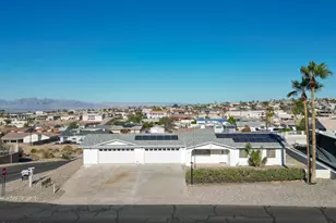 Welcome to your new lake view home, featuring a full array of amenities that Havasu buyers desire! This residence boasts a permitted addition at the back, which includes a HUGE family room with wood burning stove and sliding doors leading to the covered patio with new ceiling fan. There as office/home gym connected to the master suite! Inside, you'll find three generous bedrooms and two bathrooms, a kitchen with granite counters and a formal living room. The massive four-car garage features a 3/4 bath and lots of built-in storage cabinets. Recent updates include a four-month-old roof, a newer water heater, a new dishwasher and a new micro-hood, all complemented by an OWNED solar system to help keep electricity costs low. Enjoy stunning, panoramic lake views from the covered patio, and take advantage of the steel shade structure at the rear of this corner lot, perfect for storing RVs, boats, or recreational toys. There's plenty of room to build an RV garage if desired! The expansive, fenced backyard offers plenty of space for a pool, and the flat driveway provides easy access to the garage. Don't miss the chance to explore this exceptional property-come see it and make it yours!