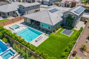 THE CROWN JEWEL! This stunning 2022 built bungalow boasts nearly 2600 sq ft of open concept living with 3 spacious bedrooms + open den, 2.5 lavish baths & gourmet kitchen overlooking the great room! Upgrades abound & include tray ceilings, wainscoting, designer paint throughout, plantation shutters, custom built fireplace wall with natural quartzite stone & much more! Entertainer's kitchen features Quartz countertops, tile backsplash, designer cabinets with soft close feature, large island, SS appliances with gas cooktop, built in oven, walk-in pantry & dining nook! 5 CAR GARAGE with 3 car tandem & RV door! BACKYARD OASIS with 20x 30 oversized heated pool & builtin Jacuzzi, in ground trampoline, artificial turf, travertine decking & plumbed for outdoor kitchen! OWNED SOLAR! A must see!