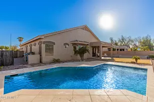 Welcome to this Meticulously maintained, one story, 4 bedroom, 2.5 bath home in Mesa's Adobe Estates. Nestled on a cul-de-sac street w/ no rear neighbors, this single story Home offers 2,604 sq ft of living space on a 8,774 sq ft lot w/ 3 car garage & RV gate. Inside you find new carpet & fresh interior paint, ceiling fans throughout and an open concept floor plan w/ lots of natural light. Kitchen w/ stainless appliances, large pantry and ample cabinets. Large primary suite w/ double doors, two closets and an ensuite bath w/ separate shower and large soaking tub as well as water room and linen closet. Enjoy mountain views from your backyard w/ partial view fence that backs to common area with desert landscaping. Custom sparkling pool, real grass, and large covered patio.