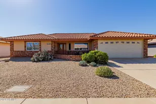 Home, sweet home! This furnished 3-bedroom, 2-bath, split floor plan offers a 2-car garage with a golf cart, charming brick accents, a low-maintenance desert landscape, and an inviting front patio. Inside, you'll find a lovely living/dining room with vaulted ceilings and soft carpeting underfoot. The eat-in kitchen comes with granite counters, abundant wood cabinetry, recessed lighting, essential built-in appliances, and a two-tier peninsula with a breakfast bar for casual meals. The cozy main bedroom features convenient patio access, a private bathroom with double sinks, and a walk-in closet. Enjoy quiet outdoor moments on the covered patio and pergola. New A/C in 2014, new hot water tank in 2023, New Roof 2025 and the home comes with a termite warranty! Make it yours now!