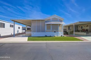 This is a lovely east facing park model with an Arizona room in Carriage Manor Resort, a premier 55+ Community where you OWN THE LAND! Outside you have a nice big tiled deck and artificial turf in front of the home, as well as pavers on both sides. Inside you'll find the walls and ceiling have been skim coated. The kitchen has all updated appliances including a double kitchen sink and reverse osmosis. The A/C on this home was installed in 2020. Carriage Manor has 24/7 on site security, a heated SALTWATER pool/spa, fitness facility, Tennis, Pickleball, Bocce, Shuffleboard, Golf Club, Billiards, Lapidary/Silversmith, Ceramics, Glass Art, Sewing, Wood shop, Bingo, Dances parties & many more activities & amenities.