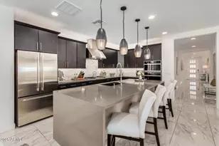Welcome to this beautifully upgraded 4-bedroom, 3-bathroom home located in the highly sought-after Alovarita Community. Built in 2021, this spacious 2,406 sq. ft. home offers modern luxury living, complete with top-of-the-line finishes and a thoughtful open concept layout. With beautiful 24''x48'' tile flooring throughout the common spaces and 6''x36'' tile in all bedroom and bathrooms. This home blends elegance with functionality, creating an inviting atmosphere for both family living and entertaining. As you step into the home, you'll immediately be impressed by the bright and airy living spaces. The heart of the home is the expansive kitchen, featuring a huge Quartz Island with a waterfall edge that provides ample seating and a striking visual focal point. Equipped with a gas cooktop... custom backsplash, and premium stainless-steel appliances including a convection oven, microwave, and a beverage cooler this kitchen is perfect for those who love to cook and entertain. The upgraded primary bedroom is a true retreat, complete with a stunning chandelier and a spa-like ensuite bath. The bathroom boasts a separate tub and shower with glass and full height tile that runs to the ceiling, a dual sink vanity with low-voltage accent lighting, and sleek finishes throughout. Every detail has been thoughtfully designed for a luxurious experience. Each of the additional bedrooms is spacious and well-appointed, providing ample space for family members or guests. With three beautifully designed bathrooms, everyone has plenty of room to enjoy their own privacy and comfort. Step outside to your backyard oasis, where you'll find easy-care landscaping with lush artificial turf, extended pavers, a large water feature, hanging lights and a cozy firepit for those relaxing evenings. The front and back yards are perfect for enjoying the outdoors with minimal upkeep. Additional features include a custom iron front security door, a two-car garage with epoxy flooring, modern cabinetry, a tankless water heat and an upgraded outlet for electric car charging. This home offers a seamless blend of modern luxury and practicality. Don't miss the opportunity to experience this exceptional property in person!