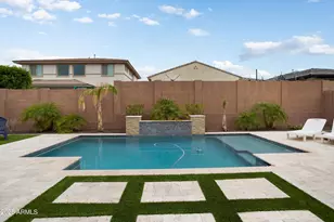 Move-in ready Energy Star residence. The open-concept design sets the stage for comfortable living and effortless entertaining. A three-car garage provides ample storage for your lifestyle needs. The heart of this home is the grand great room, a light-filled expanse that flows seamlessly into the gourmet kitchen, with a substantial island featuring a large under counter sink, professional-grade stainless steel appliances, and a high-performance gas cooktop. Expansive sliders invite abundant natural light, shutters throughout. Soaring 10-foot ceilings amplify the sense of spaciousness and light. Enjoy an entertainer's dream: a covered patio and a meticulously designed backyard oasis, with travertine tile pathways, with the tranquil sound of a water feature gracing the sparkling pool. The main bedroom suite offers, complete with an oversized walk-in shower and generous closet. Thoughtfully appointed with energy-efficient features including a tankless water heater, comprehensive LED lighting, a soft water system, and reverse osmosis, this home blends exquisite comfort with intelligent functionality.