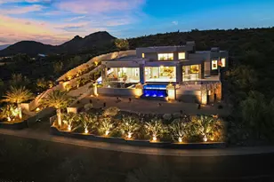 Experience everyday resort living in this iconic 1-acre gated estate, surrounded by lush Roebelenii, Bismark, and Date Palms with sweeping golf course and mountain views. Built in 2009 by a renowned architect, this home features an infinity pool with waterfall and a striking underwater window into a subterranean bar with video poker machines. Enjoy a private helipad, home theater, LED smart lighting, and an entry water feature that brings the outdoors in. A former gun range now serves as a luxury wellness space with a gym, barre studio, sauna, steam room, and stunning two-story designer closet. Granite/travertine floors, Heritage aluminum framed windows and a spa-style bath complete this extraordinary home.