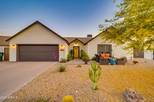 Bright, Open & Move-In Ready! Experience Arizona living in this modern Mexican-themed home, tucked away on a quiet cul-de-sac. This 3-bedroom, 2-bath, single-level residence offers a functional layout with comfortable living spaces throughout. The living room features a brick fireplace & opens to the formal dining area. The kitchen includes grey cabinetry with ample storage, granite countertops, stainless steel appliances, pantry, breakfast bar & an eat-in kitchen area. The primary bedroom offers an ensuite with dual vanities & a tile walk-in shower. Secondary bedrooms are well sized & the updated full bath features a tub/shower combo. Vaulted ceilings & multiple windows provide a bright, open feel. The backyard includes a large covered patio, sparkling pool with waterfall feature, mountain views & desert sunsets. Block fencing, refreshed front & back landscaping, an RV gate & generous lot add privacy & usability. Additional highlights include updated flooring (2022), RO system & water softener, RV parking, 2-car garage & no HOA. Ideal for a primary residence or potential Airbnb opportunity, with a short distance to Sky Harbor Airport & Angel Stadium, plus convenient access to parks, hiking trails, shopping, dining, recreation & I-10.