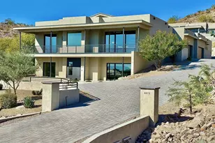 Stunning 3-year-old desert contemporary residence offering 7,700+ SF of refined modern living. Features 12-ft flat ceilings in most rooms and an impressive 18-ft great room. The home includes 6 bedrooms, 5.5 baths, plus a third-level interior suite with bedroom, bath, and loft-ideal for guests or private retreat. Expansive chef's kitchen with oversized statement island flows into open living and dining areas. Three gas fireplaces enhance comfort and ambiance. Walls of glass capture mountain and city views from most windows and extend living spaces to covered patios and decks. A private atrium courtyard serves as the centerpiece for outdoor living, featuring an infinity-edge pool with heated spa-perfect for entertaining and private dining. Additional highlights include a home theatre DON"T MISS THE VIDEOTHIS HOME HAS TO BE WALKED THROUGH TO REALLY CAPTURE.