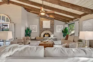 Resting beneath a canopy of mature established trees, in the gated community of Villa Valencia, this Spanish Colonial gem blends timeless character with modern comfort. Offering 2,273 sq ft, the home features three bedrooms, two baths, vaulted wood beamed ceilings, gourmet kitchen, two car garage, workroom, & a cozy wood burning fireplace creating warmth throughout. A spacious primary suite boasts a sunken soaking tub, dual vanities, ample closets, & sitting area. A charming courtyard with splashing fountain, lush established landscaping, & multiple private patios create seamless indoor outdoor living & alfresco dining. Enjoy a resort style community pool, lighted tennis/pickleball court, dog park, & a prime location near the canal, hiking, biking, the Biltmore, local dining, & Sky Ha