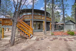 Prepare to be captivated by the VIEWS in the most unique cabin on the mountain on 1.51 acres. This stunning circular living space features expansive windows that invite the beauty of the towering pines and lush property indoors. At the heart of the room, a charming center fireplace adds warmth and ambiance, perfect for cozy winter nights. The flowing hardwood floors and tall, vaulted ceilings create a seamless and elegant atmosphere. Step onto the large wrap-around deck, ideal for enjoying both sunny days and starlit evenings. Inside, the spacious kitchen is perfectly designed for entertaining, with ample room for gatherings with a breakfast bar and a dedicated dining area. This home is close to shopping and eateries yet feels like you are in the middle of the forest. The first floor also has the third bathroom. This home has an ELEVATOR for comfort and ease of living that takes you downstairs to a thoughtfully designed living area, which includes two bedrooms and two bathrooms. The gorgeous large Primary suite boasts large windows, a luxurious raised stone soaker jetted tub, double pedestal vanities, and plenty of space to relax with a large walk in closet. The Guest bedroom is generously sized to ensure comfort for everyone with more views. There is a bathroom right outside guest bedroom. Downstairs there is a kitchette right off of the Office/Den/Entry for your ease and convenience. Outdoors, you'll find a charming seating area and a convenient two-car garage. This home is truly one of a kind - the beauty and unique features sets it above all else as you bring the outside in with tremendous views. This area of Pinetop has all custom homes on one acre minimum lots so there is ample room between you and the neighbors. The reservation is right across the road for added privacy. Also no HOA. There are 2 entrances to this home for extra ease for access. Imagine living in the White Mountains of Arizona where you have 4 beautiful seasons and where you can breathe in the fresh mountain air and enjoy the 40 lakes and over 600 miles of rivers and streams. In addition to the amazing fishing, this area has one of the most extensive trail systems in the southwest for hiking, biking, horseback riding, quadding and more. Sunrise Ski Resort is also just 40 minutes away with 3 beautiful mountains to ski, snow board or sled. If shopping is your interest, you will love the antique stores and the multitude of arts and craft shows that happen in the summer. The music festivals have something to fit everyone's enjoyment. Do you love to golf? There are 7 amazing golf courses, 3 that are public. The White Mountains, where this home/cabin is the best kept secret of Arizona! Come and explore and enhance your living! Pinetop-Lakeside was also voted 'Best Cabin Region in the U.S"... Embrace the MAGIC!