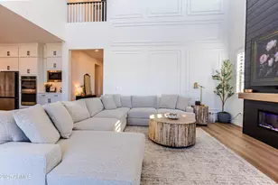 Breathtaking 5-bedroom home with mountain views & a resort style backyard! Discover your ideal sanctuary near the San Tan Mountains in this like-new 5 bedroom, 4.5 bath home offering nearly 4,000 sqft. of sophisticated living. Set on a premium lot with only one neighboring home, the property delivers both privacy and picturesque mountain views. Inside, the open-concept floor plan it's defined by soaring 21-foot ceilings, a cozy living room with a built-in fireplace featuring custom woodwork, a chic designer palette, and abundance of natural light. The gourmet kitchen features an oversized island, quartz countertops, upgraded white cabinetry, reverse osmosis system, and gas cooking. There's an abundance of space with a separate flex space which would make an excellent office behind the kitchen, a versatile loft, and flex room with double doors provide the adaptability modern living demands. Upstairs you'll find a luxurious primary suite, three additional bedrooms, one being an ensuite and a spacious loft perfect for a teen retreat. The main floor includes a private ensuite. Finishes throughout impress, from luxury vinyl plank flooring with 5.5" baseboards to custom tile in bathrooms and laundry. The 4-car tandem garage features built in cabinets, overhead storage racks, and a 220v dedicated circuit for your EV charger. Seller also installed permanent holiday lighting. Step outside to your new resort-style backyard complete with heated pool and spa, a pergola with entertainment wall and built in BBQ. Enjoy lush turf a firepit area to gather and an inviting outdoor entertaining space. This home sits on a premium oversized lot and has upgrades galore! This home seamlessly combines luxury, functionality, and privacy in a prime location, truly a must-see!