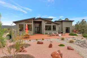 Built in 2021, this stunning contemporary residence blends sophisticated design with sustainable living on over one acre of elevated Sedona beauty. Tucked behind a fully fenced perimeter, the property offers exceptional privacy and sweeping panoramic Red Rock views from nearly every room. The thoughtfully crafted 2-bedroom, 2-bath layout includes a dedicated office with custom bookshelves and a spacious great room with soaring 15-foot ceilings, four skylights, an electric fireplace, and recessed lighting that enhances the home's clean architectural lines. The gourmet kitchen is a culinary showpiece, featuring high-end black stainless steel BOSCH appliances, Caesarstone quartz countertops, custom cabinets, oversized island, ample storage & an entertainer's dry bar with a built-in wine refrigerator. The luxurious primary suite includes a radiant-heated bathroom floor, dual vanity with tile backsplash, and premium finishes throughout. Generously sized 2nd bedroom. The guest bathroom offers a roll in shower & bench, a Delta dual showerhead with opposing control, a roll in sink & quartz counter-top. The laundry room is both functional and artful, with a custom copper-inlaid door, high-efficiency Miele washer & dryer, a utility sink, floor-to-ceiling custom shelving, and a built-in bench. Additional highlights include a BOSCH HVAC system, an oversized garage with abundant storage, and a powerful sustainability package: owned solar with 32 panels & battery, spray insulation for energy efficiency, fire resistant shingles, residential fire suppression system, and a dual rainwater harvesting system with 1,200- and 250-gallon tanks connected to an efficient drip irrigation system. Airbnb is allowed, making this property a rare blend of luxury, privacy, and income-generating potential all set in one of Sedona's most breathtaking locations.