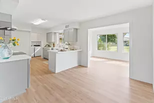Fresh, bright and updated, this 2BD/2BA Gemini home in Sun City is filled with soft natural light and peaceful greenbelt views from the Arizona room. New luxury LVP floors, 4'' baseboards, fresh paint, and a custom entertainment wall for up to an 85'' TV. Kitchen has new cabinets, quartz counters, an island, apron sink, Samsung appliances, custom backsplash, and glass pantry/laundry doors.Both bathrooms have new vanities and toilets. Washer & dryer included! New water heater and upgraded electrical. Newer Trane HVAC and roof for added peace of mind. Move in and enjoy the Sun City lifestyle: golf mornings, rec centers, endless clubs, pools, and an active-adult community where neighbors become friends. Beautifully updated and easy to love!