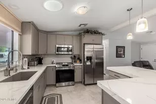 Tasteful 3-BEDROOM HOME packed with upgrades! The BRAND NEW KITCHEN REMODEL (2024) features ETHERIUM COUNTERTOPS, NEW warm gray CABINETS, new LVP FLOORING + newer STAINLESS STEEL APPLIANCES. A BEAUTIFUL BATHROOM REMODEL, NEUTRAL PAINT & VAULTED CEILINGS create a bright, welcoming space. Major updates include a FRESHLY COATED ROOF (2024), NEWER HVAC (2022), PLUMBING UPDATED, ELECTRIC BREAKERS UPDATED 2022. Enjoy SOFT WATER SYSTEM AND REVERSE OSMOSIS SYSTEM for great water quality. The LARGE backyard w/BEAUTIFUL PAVERS is perfect for outdoor enjoyment. Plus, a SEPARATE GOLF CART DRIVEWAY adds extra convenience. Skirting under crawl space replaced in 2018 Newer patio slider to LARGE AZ ROOM. Community amenities galore like PICKLEBALL, golf POOLS restuarants, CLUBS, events & more!
