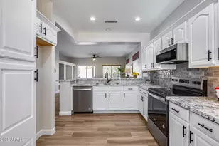 Beautifully remodeled home in Sun City Grand offering modern updates and an active lifestyle! Recent upgrades include fresh neutral paint throughout, brand-new wood-look tile flooring, plush new carpeting, and a stylish kitchen with granite countertops, refurbished white shaker cabinets, sleek black fixtures, and new top-of-the-line appliances. Relax in the spacious primary bedroom with a bay window and an updated ensuite bathroom. Additional features include a spacious 2-car garage and access to incredible community amenities, such as resort-style pools, spas, sports courts, golf courses, a clubhouse, fitness center, and a variety of social events. Enjoy the perfect blend of luxury, comfort, and community in this highly desirable 45+ neighborhood!