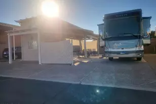 Spacious 3,087 sq. ft. east-facing lot in The Ranch at Happy Trails! This premium lot offers ultimate privacy with a block privacy fence on the west side and no neighbors behind you. The two-story shed features textured interiors, plus a stack washer, dryer, and mini fridge that stay with the property. Pull-down attic storage provides extra convenience. Enjoy outdoor living with a kitchen area at the back of the shed and a pergola for shade and privacy. The concrete lot features aggregate detailing at the front and offers generous parking for both a car and a golf cart. Located in The Ranch is an exclusive Class A motorcoach section, this lot is ready for immediate use and accommodates even the largest Class A.