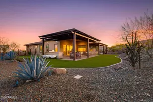 Rare ½-acre homesite with PAID-OFF SOLAR and an exceptional 5-CAR insulated, temperature-controlled garage-perfect for toys, collections, or a workshop. This sleek, open-concept home showcases 8' interior doors, upgraded paint, refined trim, and premium hardware. Chef's kitchen features quartz countertops, farmhouse sink, upgraded cabinetry, gas cooktop, and built-in oven and microwave. Spa-inspired primary suite offers an upgraded walk-in tiled shower and freestanding soaking tub. Laundry includes utility sink. The resort-style backyard is built for entertaining with an extended covered patio, expansive pergola, outdoor kitchen, low-maintenance turf, and a custom 3-hole putting green. Fully fenced yard with pest fencing. A rare blend of luxury, space, and lifestyle versatility! Resort amenities & award-winning golf!