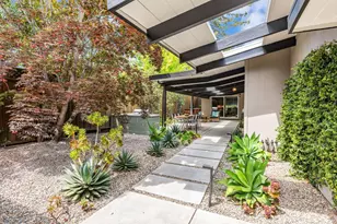 Mid Century Modern home welcomes you with a private courtyard perfect for entertaining. This home sits on one level and offers 4 bedrooms, 2 full baths plus a spacious sunroom that overlooks the yard. A bright living room features a fireplace and sits just off the kitchen. The kitchen offers lots of counter and storage space with a small built in office area. adjacent to the kitchen is a large sunroom that can easily be used as a family room. The back yard has had new hardscape installed recently and is the perfect place for play, entertaining or simple relaxation. This home also offers a detached 2 car garage with custom storage cabinets, an outlet for an EV charger and lots of off street parking as well.