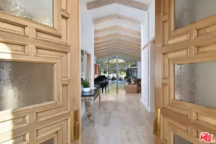 Absolutely turnkey lifestyle on a prime BH flats street. The luxury of a large single-story custom estate is the perfect short or long term "vacation" opportunity. Much better than staying in a nearby hotel, you will enjoy the privacy, quiet, and maximum convenience of moving right in to this upgraded remodeled home and having everything at your fingertips. The front entry offers that coveted "wow" factor - a huge wall of glass reveals the stunning spacious backyard. Outdoor seating and dining, and past the grassy yard, there is a gorgeous sparkling pool with a lovely serene waterfall. The convenient exterior pool bathroom is a smart and super useful amenity. The entire yard is surrounded by an over-sized fence with towering privacy hedges. This gated, private, and luxurious home with lustrous hardwood flooring exudes warmth and instantly conveys the elegant sophistication of original owners. The custom design of this very hip Mid-Century architecture transports you to a serene experience. There's a fabulous step-down bar that opens to the private entertainer's backyard. The expansive custom-designed kitchen is the ultimate for stay-at-home cooking, or having staff prepare an elegant dinner party in the adjacent separate formal dining room. The kitchen has new appliances, a spacious walk-in pantry, and high-chair barstool seating at the breakfast bar. It's an ideal floorpan for families or out of town executives accustomed to exquisite on-trend designer finishes with very modern spacing and sensibilities. Soaring 30 ft vaulted, beamed ceilings impressively enhance the "feel" of the main living spaces. Floor-to-ceiling expansive walls of glass draw natural light into the interiors and create a seamless indoor/outdoor connection. You will appreciate the inspiring views from the private office, plus a detached studio that is perfect for any creative endeavor (music, podcast, yoga, or an additional guest). All secondary bedrooms are mini-suites that boast walk-in closets and custom tile flooring. The Primary suite on its own separate wing of the home is stunning with 2 spa-like bathrooms, a soaking tub, and 2 well-appointed spacious walk-in closets with natural light. The additional maid's room is great for traveling families. The 3-car garage with additional 4-car driveway parking allows ample access for all your guests or business associates. This truly conveys an instant sense of your own home.