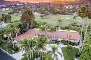 Welcome to this classic, elegant, Old Hollywood-style single-story estate, perfectly perched on top of the prestigious La Costa Golf Course to offer the most advantageous views. The circular driveway, with a beautifully tiled design at its center, sets the tone for the elegance that awaits inside. Step into the grand living room, where a stunning fireplace anchors the space, surrounded by large west-facing windows that flood the room with natural light and capture the sweeping views. The spacious dining room, adorned with an old-world chandelier, provides the perfect setting for hosting memorable gatherings. The well-appointed kitchen, complete with a wet bar and cozy breakfast nook, offers ample storage with a spacious walk-in pantry and an expansive butler's pantry. The warm and spacious family room is a true showstopper, boasting a second fireplace and massive view windows that frame the picturesque scenery. This wing of the home includes a guest bedroom with a full en-suite bath, family room, and large laundry room. The estate's private second wing includes a luxurious primary suite, and three additional spacious bedrooms. The primary suite is a serene retreat, featuring enormous windows that showcase the views, and an attached bathroom with a large soaking tub and separate shower. Outside, the backyard is a tranquil oasis with hardscaped areas perfect for seating and enjoying the spectacular views. A cascading waterfall leads to two serene ponds, ideal for koi fish or aquatic plants, with the potential to be converted into a luxurious pool. This exceptional estate offers unobstructed views of the golf course and surrounding estates, as well as western sun exposure and endless sunset views. Located near top-rated schools, shopping centers, fine dining, luxury cinemas, resorts, gyms, and more, this property offers the perfect blend of elegance, convenience, and timeless charm.