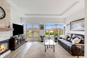 The inviting living room showcases breathtaking sunset views, complemented by a cozy corner fireplace, abundant natural light, upgraded dual-pane windows, and elegant new French doors that open to the patio. The remodeled kitchen-complete with generous counter space and extra storage-flows seamlessly into the dining and living areas, creating an inviting space for both relaxing and entertaining.