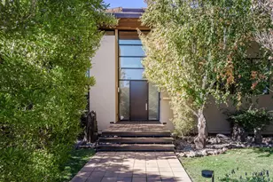 This contemporary property spans over 1.52 acres and features 5 bedrooms, 4.5 bathrooms, a rooftop deck, media room, wine cellar, & an elevator. The swimming pool & jacuzzi are solar-powered. The foyer impresses with Wenge hardwood floors, vaulted ceilings, & floor-to-ceiling windows. Nearby are the central staircase, elevator, powder room, & formal living & dining rooms, ideal for entertaining. The chefs kitchen, equipped with an expansive island & top-tier appliances, opens to a deck overlooking the pool & lawn, with a staircase to the pool area. The main level includes three bedrooms, each with a private patio. Two share a jack-and-jill bathroom, while the third has an en-suite. The master suite upstairs offers walk-in closets, a private balcony, a fireplace, & a luxurious bathroom, complemented by a rooftop deck with a fireplace. The lower level features a fifth en-suite bedroom with a balcony, a home office, media room, great room with kitchen & pool-accessible bathroom, wine cellar, laundry room, & a garage with electric chargers. The outdoor space includes a built-in BBQ, dining & sitting areas, & a lawn with a solar-powered pool & jacuzzi. The home has three heating & air conditioning zones, distributed audio, & advanced security & climate controls, epitomizing luxury.