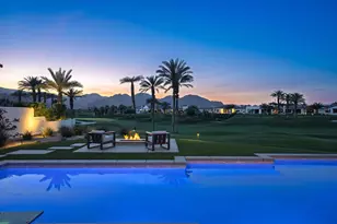 Ideally located on a quiet cul-de-sac and an oversized lot along the 11th fairway of the renowned Rees Jones-designed golf course, this stunning 4-bedroom, 5-bath home offers unrivaled views of the Santa Rosa and Coral Mountains - an idyllic backdrop for vibrant sunsets. Inside, a light-filled great room features porcelain tile flooring, a dramatic split-face stone fireplace, and built-in surround sound for immersive entertainment. Automated 12-foot glass pocket doors vanish with the push of a button, blending indoor comfort with outdoor elegance. A wet bar adds the perfect touch for effortless entertaining. The gourmet kitchen is a chef's dream, complete with Caesarstone countertops, a glass tile backsplash, and premium Wolf, Asko, and Sub-Zero appliances. Custom office cabinetry and designer lighting elevate the home's modern sophistication. The primary suite is a luxurious escape with direct access to the backyard, where a saltwater pool, spa, tanning shelf, and built-in BBQ set the stage for the ultimate outdoor retreat. A cozy firepit invites evenings spent stargazing under the desert sky. The detached casita offers a private space for guests, a home office, or personal gym. Equipped with solar panels for energy efficiency, this designer-furnished residence is the pinnacle of luxury living in Andalusia Country Club. Come live the life you've always imagined!