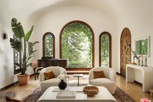 Timeless allure awaits you in this magnificent 1928 Spanish-style residence. Perched above the street, this masterpiece was crafted by the finest artisans of its time and has been meticulously restored to its former glory, with exquisite designer updates. Every corner of this residence exudes sophistication and craftsmanship, from the elegant, rounded wood moldings and ornate hardwood floors to moody Farrow and Ball wallpaper and seductive vintage Murano glass light fixtures. The step-down living room, with its high barrel-vault ceiling and an ornate fireplace, is the heart of the home, providing the perfect space to entertain while offering beautiful views of the lush hillside surroundings. Indulge your culinary desires in the elegantly designed chef's kitchen with an extraordinary 19' Calacatta marble floating shelf and backsplash, luxe Danish cabinetry, Perrin & Rowe brass fixtures, and high-end appliances including a Gaggenau range, Bertazzoni oven, and paneled refrigerator and dishwasher. Spend mornings in the sun-filled rotunda breakfast room and evenings at the built-in mirrored bar that will be the envy of all your friends. The wide atrium hallway, with in-lay cabinetry and oval skylight, leads to four spacious bedrooms, each with high coved ceilings. Both ensuite baths feature lilac marble and porcelain tile; the extraordinary hall bath was renovated to open into a separate shower with original skylight overhead. Enjoy dinner al fresco on the expansive front deck overlooking silhouettes of the palm trees that line the neighborhood, or walk the secret stairs to LAMILL, Botanica, or L&E Oyster and return to a restful backyard with outdoor shower. Meticulous updates include upgraded electrical and copper plumbing, CAT-5 wiring, rebuilt fireplace, and much more. Thoughtfulness and glamour are woven into every aspect of this home so that you, as the fortunate buyer, can simply relax and revel in the splendor of this impressive residence.