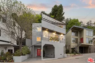 A modern and lofty contemporary with views set in the Franklin Hills section of the vibrant neighborhood of Los Feliz. Walk through the statement red front door and ascend to a welcoming open and airy living room with elevated beamed ceilings, plank oak hardwood floors, metal and glass railings, recessed lighting, angled walls that bounce the abundant natural light throughout, and glass doors that open to a balcony that frame the beautiful views of the Silver Lake hills. The dining room is perfectly balanced in an alcove between the living room and kitchen and is centered by a modern metal chandelier. The spacious kitchen features abundant cabinetry, granite countertops, glass tiled backsplash, a stainless-steel gas range and refrigerator, wine fridge, dishwasher, and a glass door that opens to an expansive entertainer's patio that includes a covered section for al fresco dining, a place to BBQ, a built-in planter for your herb garden, and an area to kick a ball around. A bathroom with a rainfall shower with a chrome detachable wand and a closet with a stackable washer and dryer with lots of room for storage complete this level. The upper level of the home houses all three bedrooms with a large landing and a vaulted skylight. The serene primary bedroom that floods the room with sunlight at sunrise includes open-beamed ceilings, frosted glass closet doors, angled walls, and glass doors that open to a long balcony with sweeping views from Glendale, the San Gabriel mountains, Silver Lake hills, and beyond. It is the perfect spot to sit and drink your morning coffee. The second sunny bedroom also opens to the balcony. The back third bedroom has glass sliding doors that open to a large deck that overlooks the landscaped backyard. The spa-like bath boasts Carrara marble tiles and countertop, a soaking tub with a shower, a seamless glass door, and a toilet with a bidet. On the street level at the side of the home, there is a bonus room with a separate entrance, which makes a fantastic home office, studio, or gym, and has a large closet that could possibly be turned into a bath (check with your contractor). Other amenities include central air & heat with the Nest app (main house), double-paned windows and doors, 2 parking spots (carport), Lutron programmable dimmer switches, a tankless water heater, and a Ring front door camera/doorbell. Some furnishings will be available to purchase. This home is conveniently located just blocks from Gelson's, Trader Joe's, Tomato Pie, Barbrix Wine Shop & Restaurant, and minutes to Sunset Junction, Silver Lake, Griffith Park, The Greek Theater, and Vermont and Hillhurst Avenues.