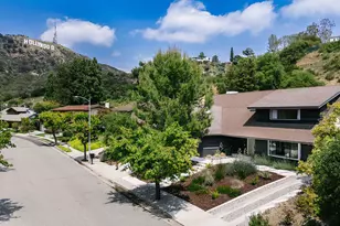Nestled on a peaceful cul-de-sac street within the illustrious Lake Hollywood Estates, this enchanting two story residence doubles as the perfect family home and an ideal hub for entertaining. Pass through the entry foyer into the light-filled front living room with large picture window overlooking the newly landscaped front garden. Rounding out the first floor are the dining room, kitchen, guest bathroom and den, all of which open onto the spectacular flat backyard. The den is the perfect hangout room with cozy fireplace, built in bookshelves and wet bar, and can double as a downstairs guest bedroom. Step upstairs to discover the spacious primary bedroom suite complete with multiple closets, large ensuite bath with vintage Hollywood vibes, and verdant hillside views. Down the hall, three additional bedrooms share a large hall bathroom. The oversized garage offers plenty of room for parking and storage, with potential to become a future attached ADU. Tucked above the garage is a generously sized, light-filled bonus room, perfect for a home office. The backyard boasts an impressive 5200+ sq. ft. private oasis surrounded by golden-tinged hills and a view of the Hollywood sign. Dine al fresco under the covered patio spanning the entire width of the house, lounge on the lawn, play basketball or badminton on your private concrete "court," or take a dip in your sparkling pool. Many thoughtful upgrades include stunning plain sawn white oak floors; newly renovated downstairs bath with spacious steam shower, handmade tile, and direct access from the pool; interior and exterior paint; all new landscaping in the front and rear yards; redone driveways and gates; updated HVAC system; new 200 amp panel, and much more. With so much quiet and beauty you'll feel far from the city, but you're just a walk or bike ride to Lake Hollywood and numerous hiking trails and a short drive to the studios and streamers, Hollywood and the valley.