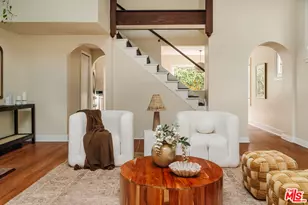 Nestled within a lush courtyard featuring a century-old fountain, this rare townhome awaits a quintessential artist's retreat, blending classic Spanish charm with old Hollywood allure. The front door opens into a grand two-story living room with dramatic cathedral ceilings, hand-carved beams, an adobe fireplace, and expansive floor-to-ceiling windowsall bathed in natural light from a skylight above. The inviting dining area, framed by romantic French doors, opens to a private, sun-drenched patio and connects seamlessly to a fully equipped kitchen featuring stainless steel appliances.On the second level, a well-appointed bedroom is accompanied by a beautifully updated bathroom. At the top of this three-level home is a sprawling, fully finished room that can accommodate all your needs, offering space for a bedroom, office, and cozy reading nook. Additional highlights include an in-unit washer/dryer, a powder room, and direct garage access. Set back from the street, this property is ideally located just blocks from the best dining, entertainment, and shopping on Melrose, Sunset, and Hollywood.