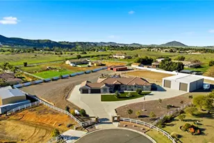 Tucked away in the highly desired community of Gavilan Hills at the end of a private cul-de-sac, this extraordinary custom built equestrian estate offers a rare blend of refined luxury, expansive grounds, and purposeful design across 2.46 scenic acres with panoramic views. Pulling up, you reach a private automatic gate to lead you up the expansive driveway and straight ahead is the property and to the right is the oversized RV garage with all the bells and whistles. The 3,596 square foot residence has been thoughtfully remodeled to elevate both comfort and sophistication, highlighted by luxury vinyl flooring throughout the home, a designer kitchen adorned with marble countertops and a giant island, ambient under-shelf and toe-kick lighting, and a curated wine nook that invites effortless entertaining. There are ample windows in the kitchen, dining, living, and bonus room for natural light and beautiful views of the grounds. Motorized window shades in the back of the home integrated with the security system and classic California shutters in the front add a layer of modern convenience and timeless appeal. There is a convenient bedroom/office towards the left wing of the home as well as a connected 4 car garage with epoxy flooring (single bay is a double with convenient pull-through) complete with an EV plug and Transfer switch on the electrical panel to protect against power outages for multiple breakers. The right wing of the home offers 4 additional guest bedrooms with 2 jack and jill bathrooms and the primary en-suite is at the end of the hall with sliding door to the backyard, dual closets and massive bathroom. Beyond the home, the estate truly distinguishes itself. A striking 3,000 sq ft double RV garage with 10,000 load capacity vehicle lift, full bathroom and dual RV 50 amp/septic/water hookups inside AND outside the building. The equestrian facilities are equally impressive, featuring a generous arena approximately 120' x 105' with decomposed granite footing and top quality 440 fencing, along with a dedicated Castlebrook barn offering three stalls, tack and feed rooms, and a complete wash station. The outdoor living experience is completed by manicured quality turf, an expansive Alumawood-covered patio with integrated lighting and fans, a spa, BBQ area, and multiple gathering spaces perfectly positioned to take in dramatic sunset views. This is a rare opportunity to own a turnkey ranch estate where luxury, lifestyle, and land converge seamlessly.
