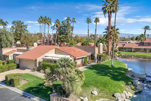 Exquisite Lakefront Condo! Discover this former model home, perfectly situated in one of the most desirable locations within the Rancho Mirage Racquet Club. This stunning condo offers direct lakefront views, surrounded by lush landscaping and breathtaking mountain vistas. Featuring a spacious 3-bedroom, 2-bathroom layout, the home has been beautifully updated with a modern kitchen, quartz countertops, stainless steel appliances, and porcelain tile flooring throughout. Dual pane windows and sliders enhance energy efficiency and comfort. Enter through the elegant glass double doors into an open floor plan with high beamed ceilings, where natural light flows from the interior atrium, creating a welcoming ambiance. Ideal for entertaining, the large island extends into the main living areas, perfect for hosting dinner and cocktail parties. The serene patio off the living room overlooks the lake, offering a private oasis. The grand primary bedroom boasts an oversized cedar-lined walk-in closet, while the spa-like primary bathroom features a double vanity and a zero-entry shower for easy access. Two guest bedrooms share an updated bathroom with direct entry from one of the bedrooms. Additional conveniences include an indoor laundry room and a garage with epoxy flooring. Rancho Mirage Racquet Club is a gated community with active amenities, including tennis, pickleball, clubhouse and gym. Its proximity to restaurants and shopping ensures a convenient lifestyle.