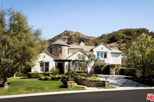 Privately tucked away behind the gates of the exclusive Sycamore Canyon Estates, is this contemporary Mediterranean estate with a stunning mountain backdrop. Upon entering the double height foyer guests are welcomed by pristine Oak flooring, wainscoting, arched hallways and a dramatic winding staircase. The highly functional floorplan showcases the formal living room with a cozy fireplace to the right of the formal entry and an office with custom built-in's to the left. An elegant formal dining room flows into the kitchen through a butler's pantry with an abundance of additional storage space and prep areas. A true chef's kitchen is fully equipped with stainless steel appliances, a generous center island, and charming breakfast table nook overlooking the backyard. A stone clad fireplace and custom built-in's are displayed across the living room wall creating a perfect mix between sophistication and comfort. The main floor offers a primary suite, in addition to the second primary suite on the upper level, which provides a seating area, luxurious en-suite and considerable walk-in closet. The primary suite on the upper level is just as lavish with a double sided fireplace adjoining its' seating area. A marble adorned spa like en-suite with dual sinks, free standing soaker tub, and spacious shower are sure to be enjoyed by the most discerning buyer. Two additional bedrooms, each with private en-suites, and a bonus room perfect for an office, home theatre, or playroom complete the second floor. All of the, nearly one third of an acre, lot has been transformed into an outdoor oasis. A grassy pad with stone path leads to the in-ground pool with a waterfall hot tub. After taking a dip, guests can dry off in one of the two cabanas in front of the outdoor fireplace and then enjoy a meal at the outdoor kitchen equipped with a barbecue and pizza oven. A perfect execution of resort like living while being conveniently located near hiking trails, Westlake's upscale boutiques and dining destinations, and beaches.
