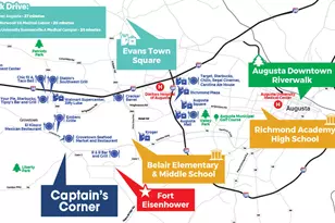 - Driving Directions: GPS use East Robinson Avenue & Vine Lane Augusta, GA 30909 From Augusta, take Gordon Hwy/US-25 South approx. 14 miles. Turn right onto GA-223. Captain's Corner is 1/4 mile on the right. From Gate 6, travel straight on E. Robinson Ave for 1/4 of a mile. Captain's Corner is on the right.