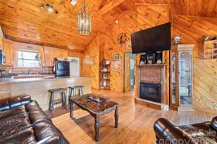 Perched on a ridge overlooking the Blue Ridge Parkway, this charming log cabin features a brand-new roof and sweeping winter views in multiple directions, with the potential for year-round vistas. A fenced front yard adds convenience, while one-level living with vaulted ceilings and exposed beams creates a warm, inviting atmosphere throughout. The great room showcases tongue-and-groove ceilings and a cozy gas-log fireplace, flowing seamlessly into the kitchen with a long breakfast bar open to the living area-ideal for entertaining. Step out onto the back porch to grill, relax, and take in the mountain setting. Both bedrooms offer private en-suite baths, and a spacious laundry/pantry provides excellent storage. The full basement is plumbed for an additional bathroom and offers garage/workshop space, with parking available at both the main level and basement level. Additional features include propane service for the fireplace, range/oven, and water heater; wall heaters; refreshing mountain breezes with window-unit cooling; a water filtration system; and a shared well serving three homes on this parcel. Road maintenance is handled by the voluntary Hornbuckle POA ($330/year). Short-term rentals are allowed, ATVs are welcome.