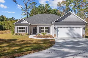 Custom Built Home (2024)! No HOA! On 1.18 acres! Bring your boat, RV, ATV, dog, clothes to this move-in ready home. In addition to the builder upgrades, the owner added a beautiful pergola, fence, and stylish black gutters with leaf guards (all convey). Think Luxury Farmhouse with open concept and split bedroom plan. Tons of natural light, high ceilings, and no carpet make this home feel even bigger than it is. Off the foyer you will find two bedrooms and a bath on the left, the living room and kitchen straight ahead and an office to the right. Down the hall is a large laundry room with cabinets (washer and dryer negotiable), entry to the garage and around the corner, the primary suite. The living room has shiplap accent wall w/ floating shelves, tray ceiling, modern ceiling fan, and built-in electric fireplace. Kitchen has a dining area, large work island, quartz countertops, farm sink, black cabinet pulls, stainless appliances (convey), and undercabinet lighting that really shows off the lovely tile backsplash. Enjoy views of the huge, fenced backyard from the Carolina Room (or formal dining room). Besides the 3 bedrooms you also have an office with french doors (has a closet so could be a fourth bedroom). The very private primary suite is large with a tray ceiling and the ensuite has a shiplap accent wall, gooseneck lighting, modern mirrors, double vanity, a fully tiled walk-in shower and a large walk-in closet. The lot extends much farther back than where the fence lines are so there is plenty of room for a pool, shed or additional detached garage. Expansive patio is perfect for outdoor life (patio furniture conveys). Ideally located less than 4 miles to Hwy 22 and 14 miles to the beach. TOUR TODAY!