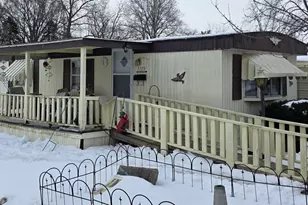 Older singlewide trailer on a corner lot with detached garage, privacy fence, front and back decks, storage shed and wheelchair ramp in front.