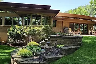 Based on Frank Lloyd Wright design, this USONIAN-style home hosts scenic overlook of Fox Riv & surrounding landscape. Curved driveway draws you in through dbl craftsman doors. To west: sitting area w/wetbar, LR, DR w/craftsman lighting, 4-season rm & studio/office. To east: 3 BRs shaped specifically to the design PLUS gracious primary suite. Primary BR has patio doors to dedicated paver patio, 3-sided FP, soaker tub, dual sinks & large tiled shower. In the center of home is 2nd living area w/expansive view, 2nd patio access & well-appointed kitchen. Rec Rm in LL w/casement windows & outside access + workshop. Ext water feature, stairs & planters blend w/this home's surroundings. Unique opportunity to own a thoughtfully-designed home which blends organic design w/modern functionality.