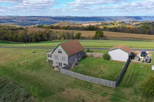 Escape to the bluffs with this stunning A-frame retreat overlooking the Mississippi River! Set on 16 private acres, this one-of-a-kind property blends rustic charm with endless potential. Soak in panoramic views from your living room, relax in the fenced yard, or tinker in the oversized 2-car garage. Inside, the open layout features 2 bedrooms and 1 bath, with an unfinished lower level already plumbed and ready for expansion?easily convert to 3?4 bedrooms and 2 baths. A rare opportunity to own a piece of Driftless paradise?peaceful, private, and full of promise. Minutes from boat landings, hunting, hiking, and everything the river has to offer!