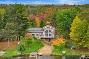 Lake Camelot Waterfront Home! Step inside a spacious foyer and be awed by an exceptionally light and open quality home with million dollar views! A gorgeous kitchen with tray ceiling featuring granite tops, light cabinetry and breakfast bar, flows seamlessly into the sun room and study which are rich in endless lake vistas. In the original A-frame inspired wing, find rustic wood lined walls, high vaulted ceilings, and soaring windows. Relax in the living room by a unique tile fireplace, deluxe wet bar, and sliding door to the deck. The primary suite comes with its own balcony and loft overlook. Heated tile floors, generous rooms downstairs, plus a LL walk-out, two utility areas and a safe room. Loads of sandy beach, and a heart-stopping 50' long garage! A home for all seasons! In Rome!