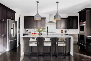 Tucked between a picturesque pocket park and the large Central Park, this stunning Infinity home has the BEST location and epitomizes modern elegance. An open concept floorpan at its finest - the heart of the home is the showstopping remodeled kitchen complemented by a two-story statement fireplace in the adjacent light-filled living room. The kitchen welcomes at-home soirees with a quartz waterfall island, Wolf appliances, a Sub-Zero beverage center, JennAir refrigerator, warming drawer, and custom lighting. Entertain effortlessly with a seamless connection for indoor-outdoor living through the breakfast nook and dreamy backyard with its built-in gas firepit, gas grill, water feature, + landscape lighting. The spa-like primary bath features heated tile floors, floating double vanities, an expanded dual-head shower and a freestanding soaking tub. Thoughtful updates include new carpet, metal stair railing, new lighting, and fresh interior paint. Additional highlights include dual custom primary closets, a new AC (2024), a new roof with Class 4 shingles (2025), built-in speakers in the dining room + kitchen, outdoor speakers in backyard patio, hand-troweled walls, home theater system with a 4K projector + sound system, suspended garage storage system, and a freshly stained fence. Ideally located within walking & biking distance to park, trails, Jet Stream Pool, top-rated schools, and endless dining options. 5-minute walk to the bus stop for McAuliffe. Easy access to the Anschutz Medical Campus, downtown, & DIA. This home offers an unparalleled luxury lifestyle. Link to video: https://vimeo.com/1067751494