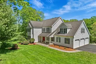 Elegant Colonial Retreat w/ In-Law Potential Nestled on 1.39 Private Acres in serene wooded setting! Nutmeg Acres subdivision is a private enclave of just 4 homes w/ a timeless blend of sophistication, comfort & flexible living. 4 spacious bedrooms, 3.1 bathrooms, 3-car garage + versatile bonus spaces perfectly suited for modern life w/ abundant privacy. Graceful architecture framed by mature trees, rolling lawn & tranquil views. Welcoming main level with flow! Entry foyer w/ 9-ft ceilings & hardwood floors that continue throughout much of the home. To the left, classic French doors open into the formal living room w/ wood-burning fireplace adding warmth & ambiance. Adjacent formal dining room, ideal for hosting holiday dinners & special occasions. Flowing from the dining room is the heart of the home: bright, eat-in kitchen & open family room! Kitchen offers granite counters, maple cabinetry, & breakfast area. Family room provides a relaxed environment for gathering, enhanced by a glass sliding door opening to your expansive wood deck spanning the length of the home. Upstairs features 4 generously sized bedrooms + two full bathrooms. Primary bedroom suite is a peaceful sanctuary w/ vaulted ceilings, hardwood floors & an abundance of natural light + spacious walk-in closet & en suite bath w/ dual vanities, jetted tub & stall shower. Offers due 5/20 at 9am