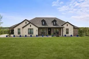 Set on over an acre with breathtaking country views and unforgettable sunsets, this beautifully designed home offers the perfect blend of space, style, and comfort. From the moment you arrive, the designer landscaping and expansive three-car garage create a striking first impression, while the fenced backyard and extended concrete patio invite you to enjoy outdoor living at its finest. Inside, the open-concept layout seamlessly connects the kitchen, dining, and living areas, all filled with natural light from an abundance of windows. The living room features a cozy fireplace, creating a warm and inviting focal point. The kitchen is a true showstopper with crisp white cabinetry, designer hardware, and stunning granite countertops-perfect for both everyday living and entertaining. This spacious five-bedroom, four-and-a-half-bath home is thoughtfully designed with functionality in mind. The primary suite offers a relaxing retreat with dual vanities and plenty of space to unwind. Secondary bedrooms are generously sized, including a Jack-and-Jill bath setup and an additional bedroom with its own private en suite. A dedicated office provides the perfect work-from-home space, while a second living area offers flexibility as a game room, media room, or flex space to fit your needs. Additional highlights include a large, well-appointed laundry room, covered front and back porches, and peaceful outdoor spaces that make it easy to enjoy the beauty of country living, all on an oversized premium lot-just minutes from modern conveniences.