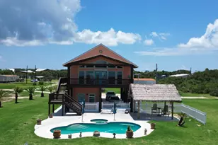 Discover breathtaking views of Matagorda Bay and Powderhorn Ranch from this charming two-bedroom, three-bathroom home, complete with a flex room. Perfect for Airbnb rentals or as a permanent residence, this property offers unparalleled coastal living with stunning sunsets. The downstairs multi-use room features its own split-unit air conditioning and a three-piece bath, making it ideal for large families. An open-air lift leads to the upstairs balcony with panoramic views. Enjoy a large outdoor cabana perfect for an outdoor kitchen, alongside a beautiful inground swimming pool with a hot tub. The property spans two lots, with an additional seven adjoining lots, offering space for a custom shop or boat barn. With six lots in front, you are ensured unobstructed views, totaling 1.44 acres. This unique opportunity allows you to own nine lots with a home and pool in beautiful Port O'Connor. The price per square foot reflects the inclusion of seven additional lots, with the home valued around $600,000.